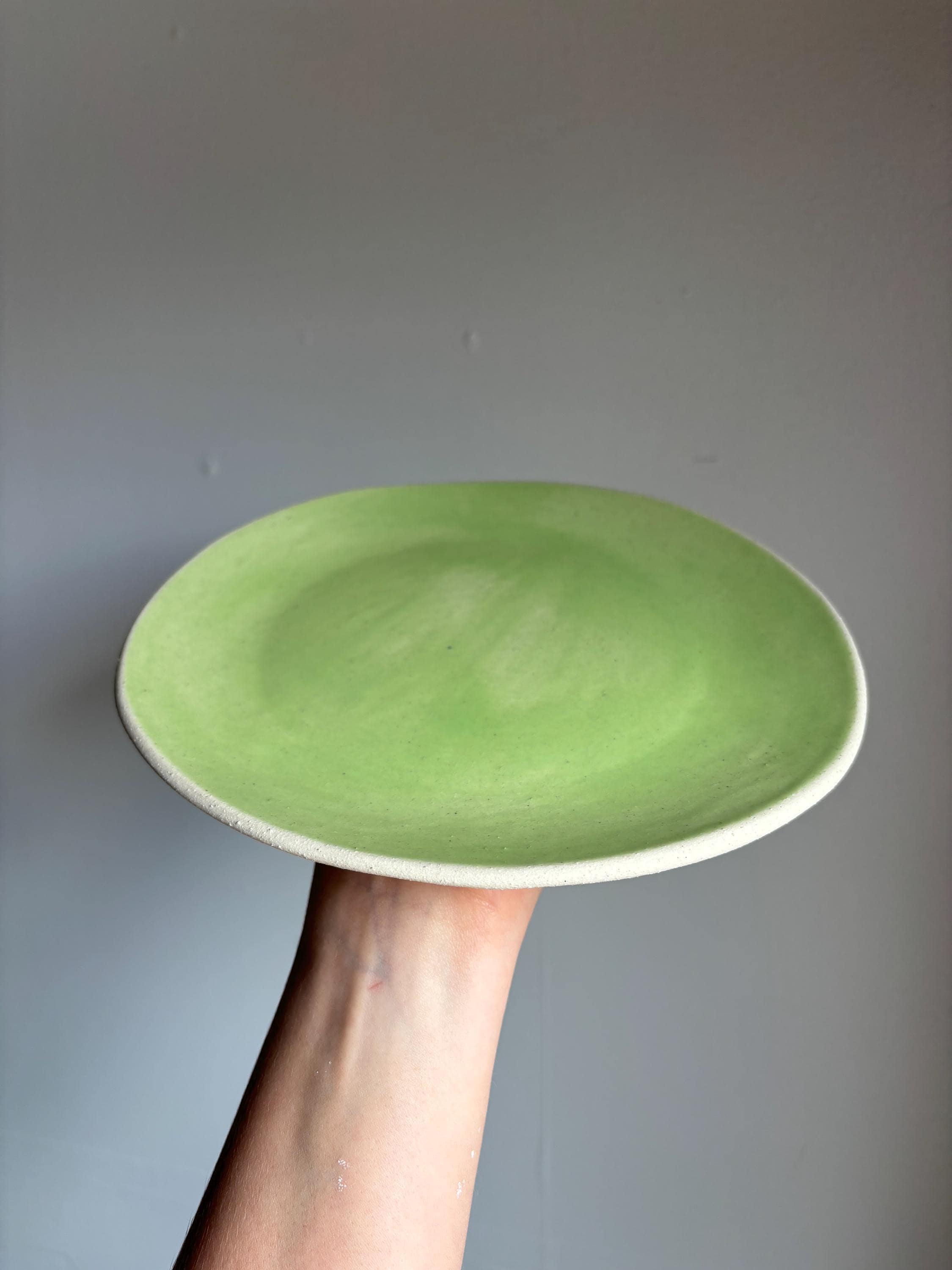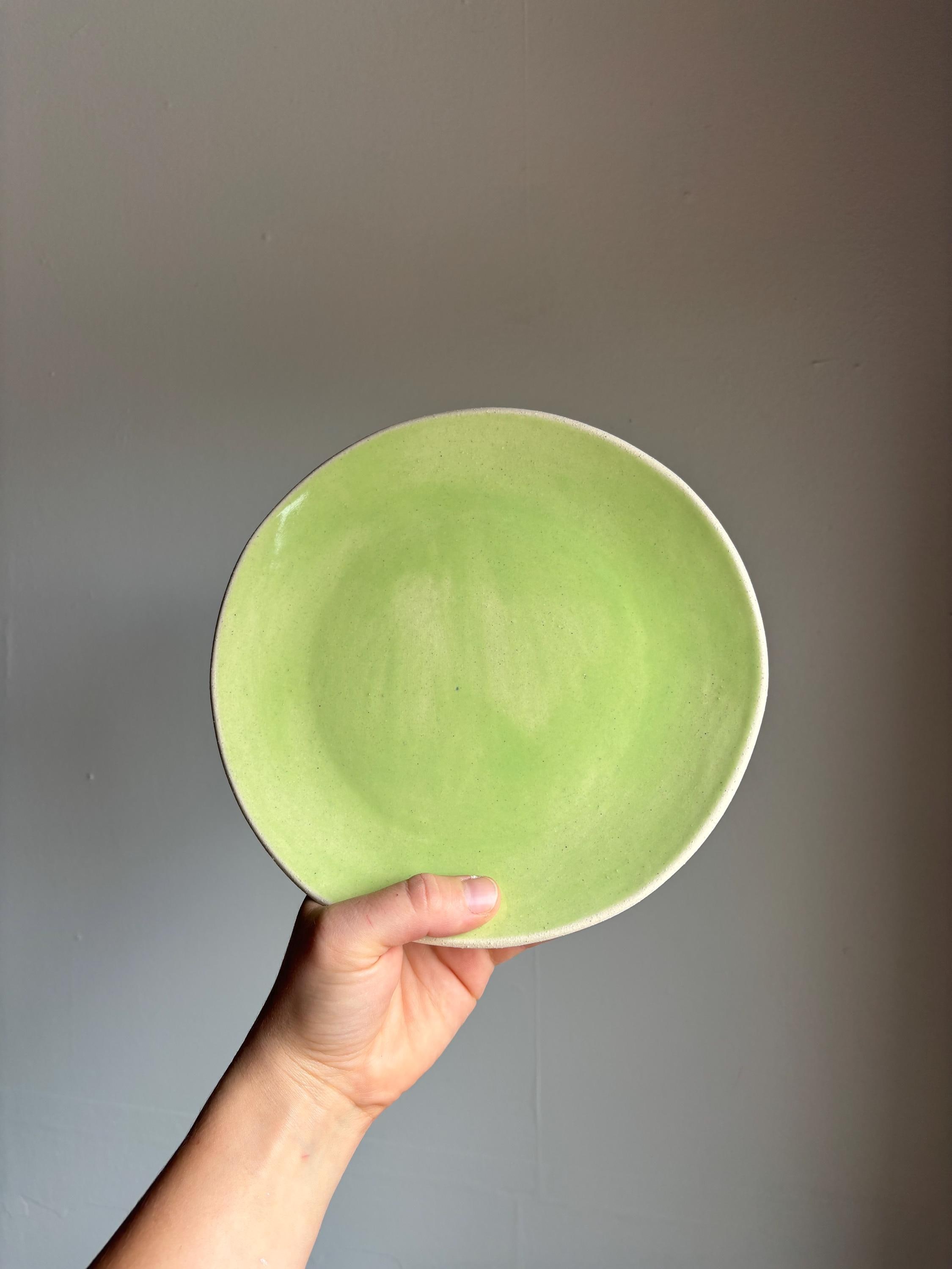 Slab built plate with glazed top and raw clay bottom.