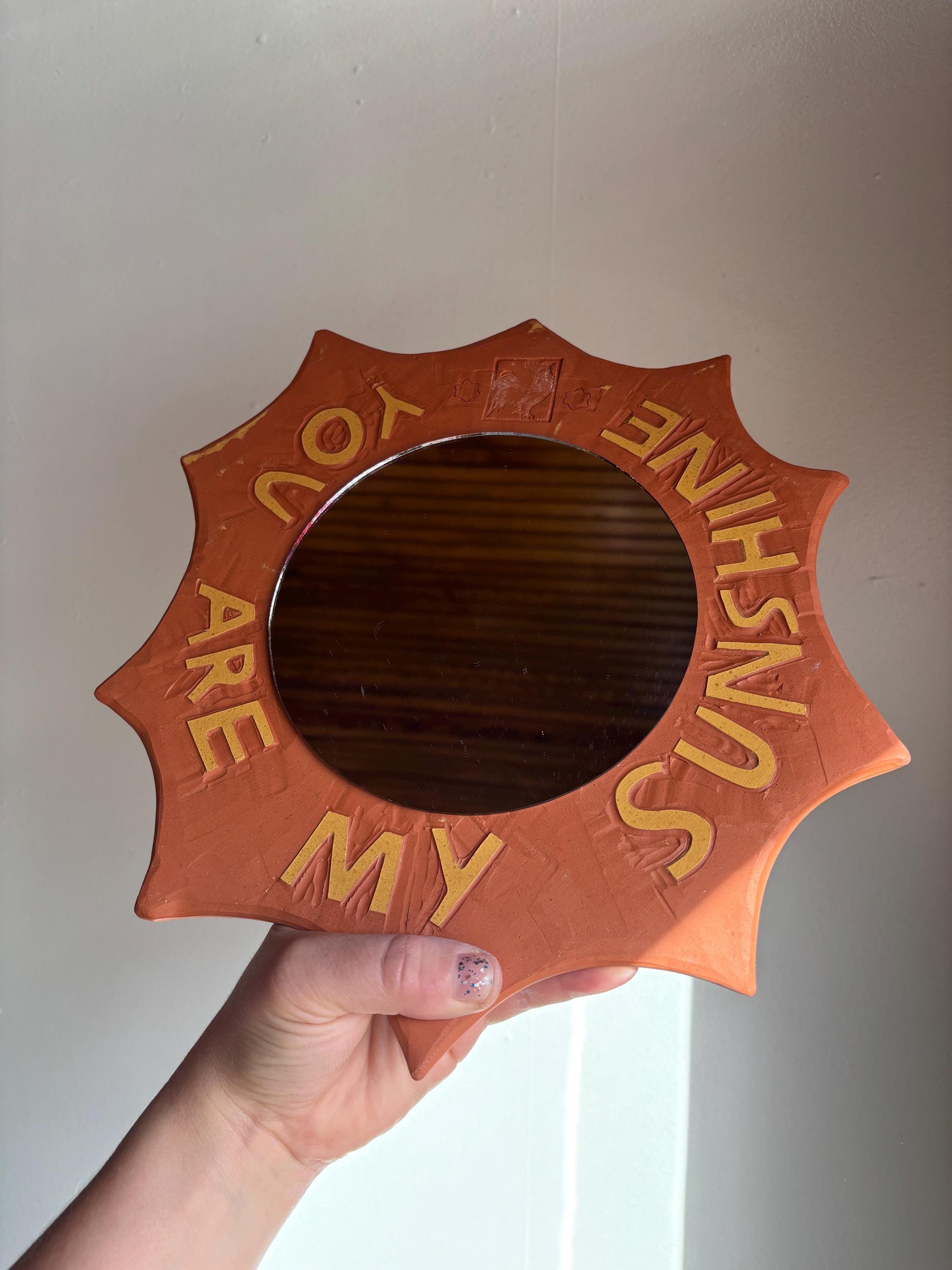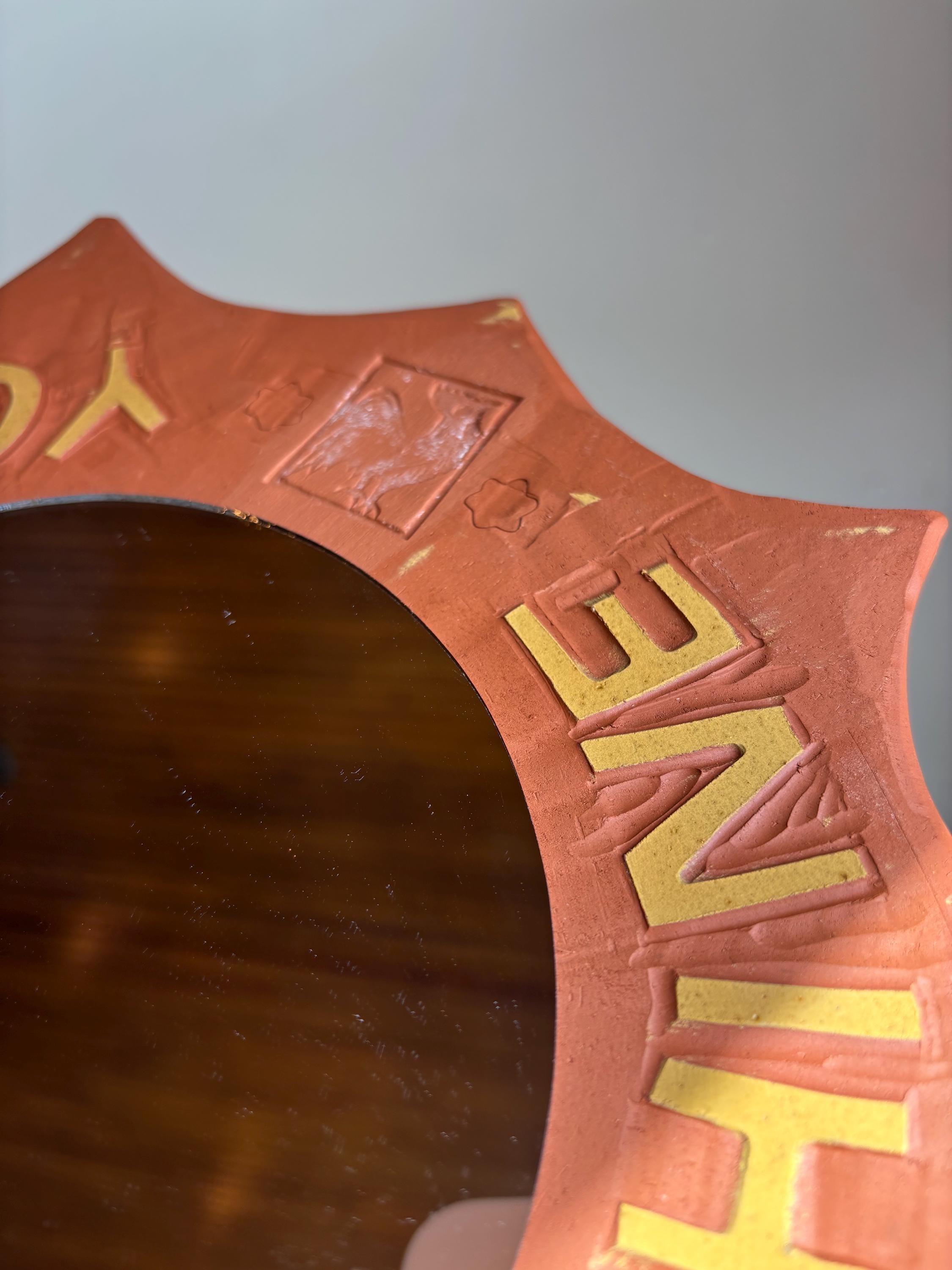 Six inch round mirror with decorative ceramic border