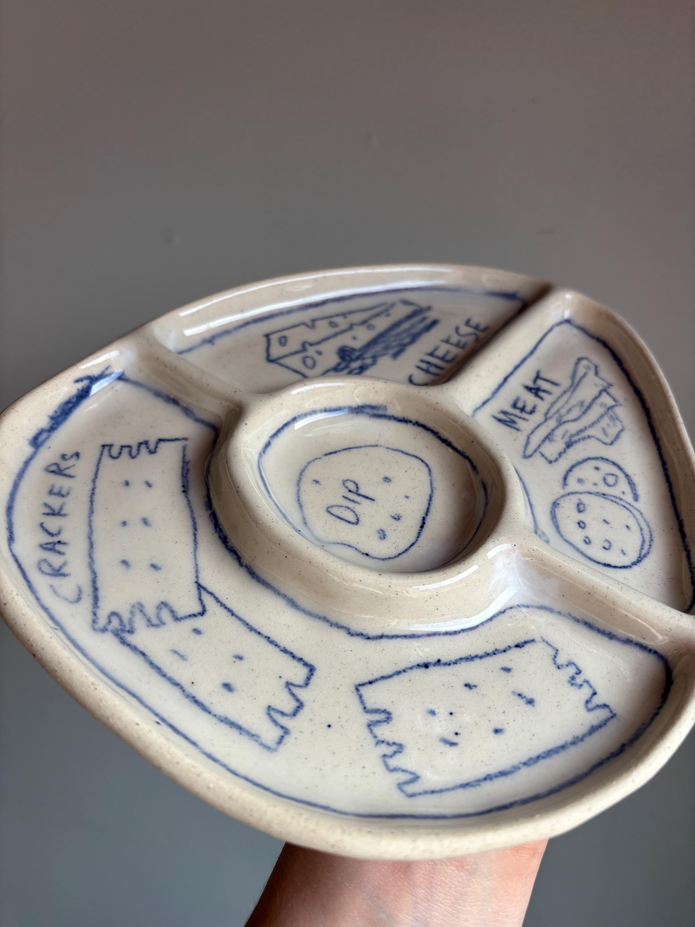 Our classic 4 section snack plate with crackers, cheese, meat, and dip doodles. This is premade and ready to ship.