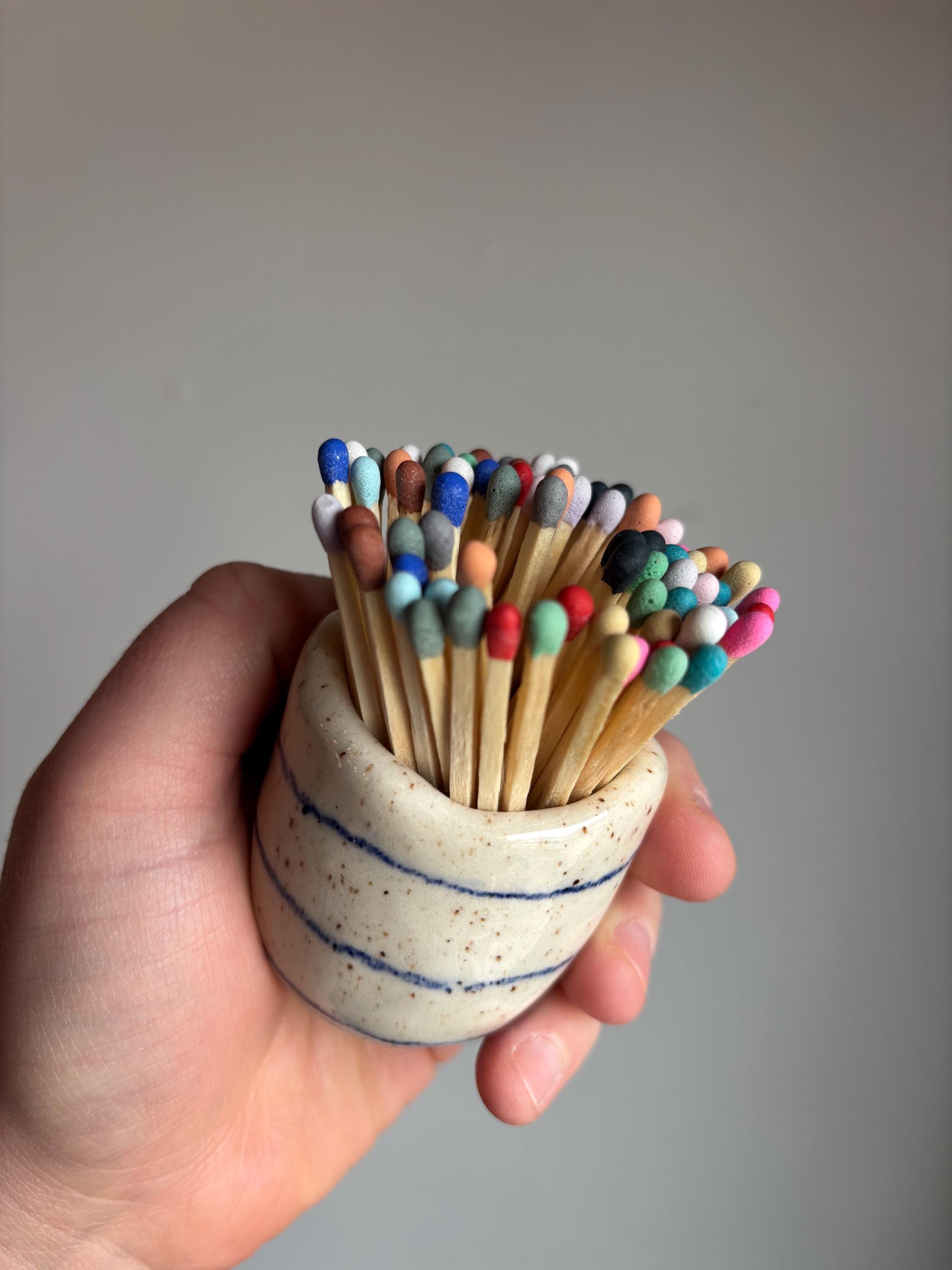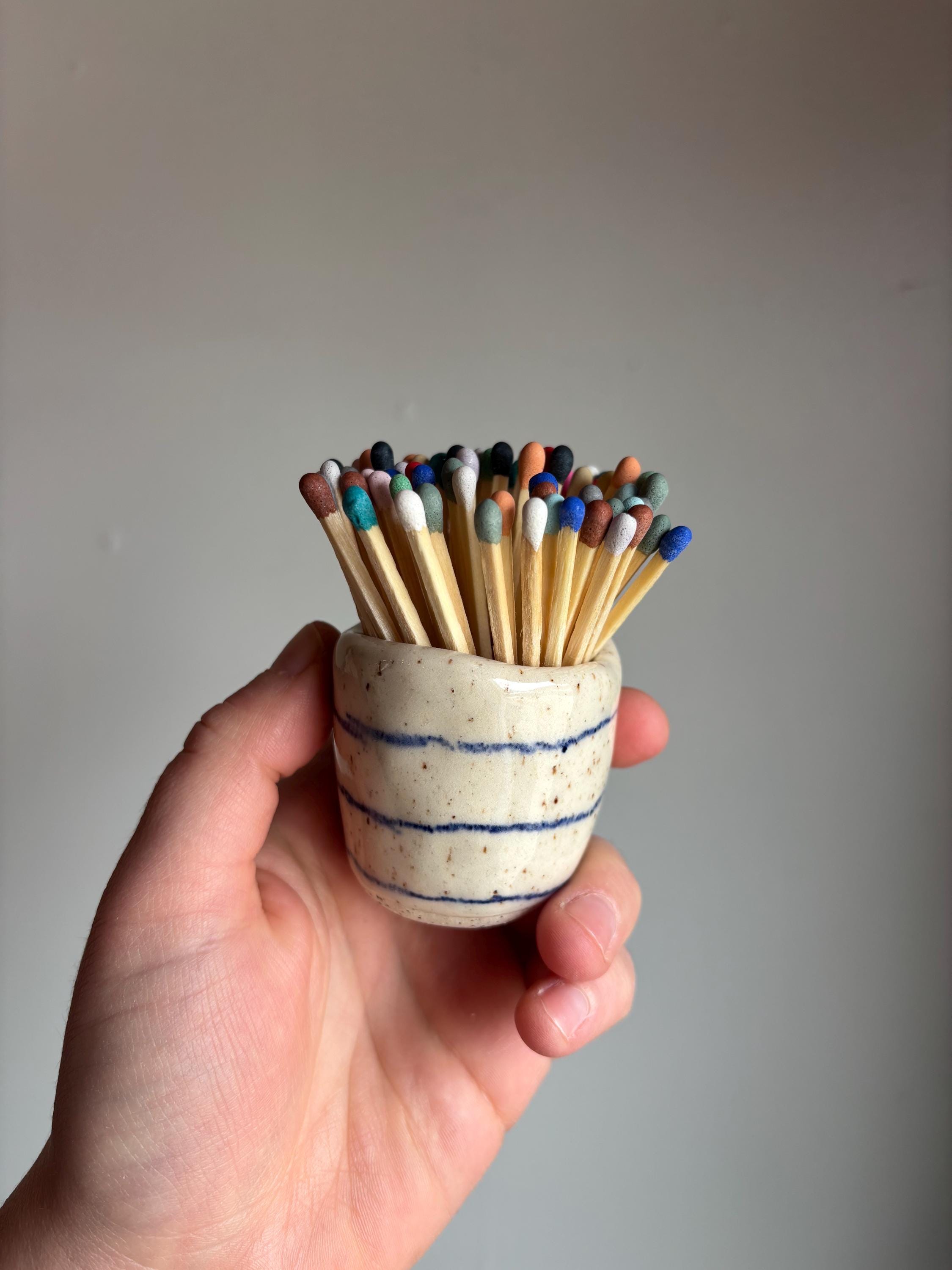Blue stripped ceramic pinch pot with match striker on bottom.