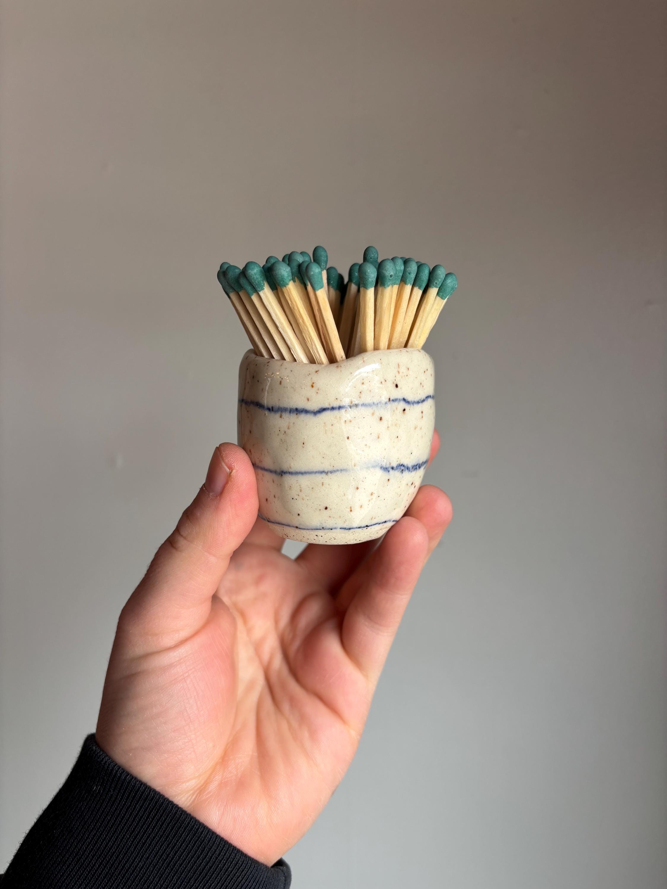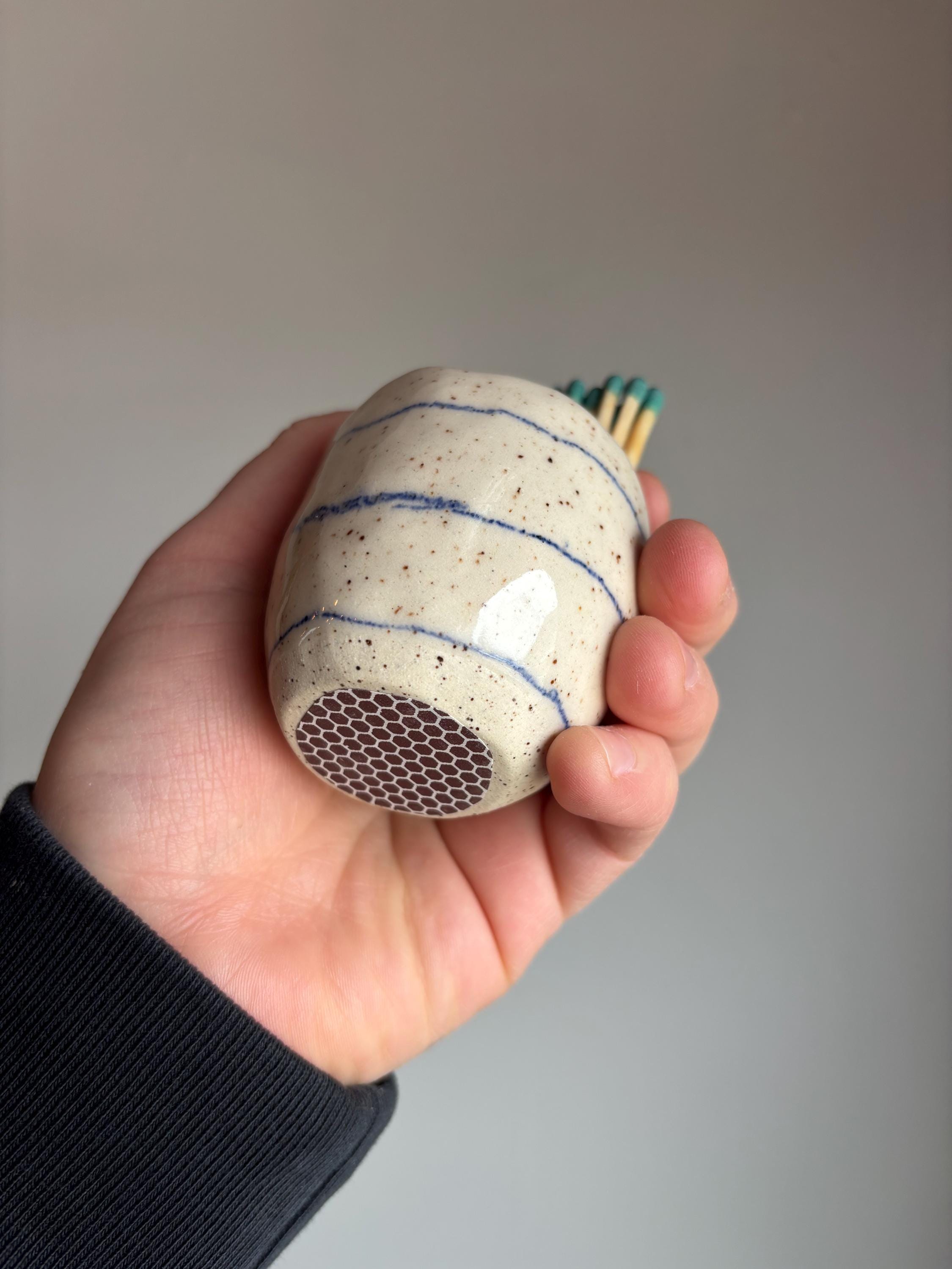 Blue stripped ceramic pinch pot with match striker on bottom.