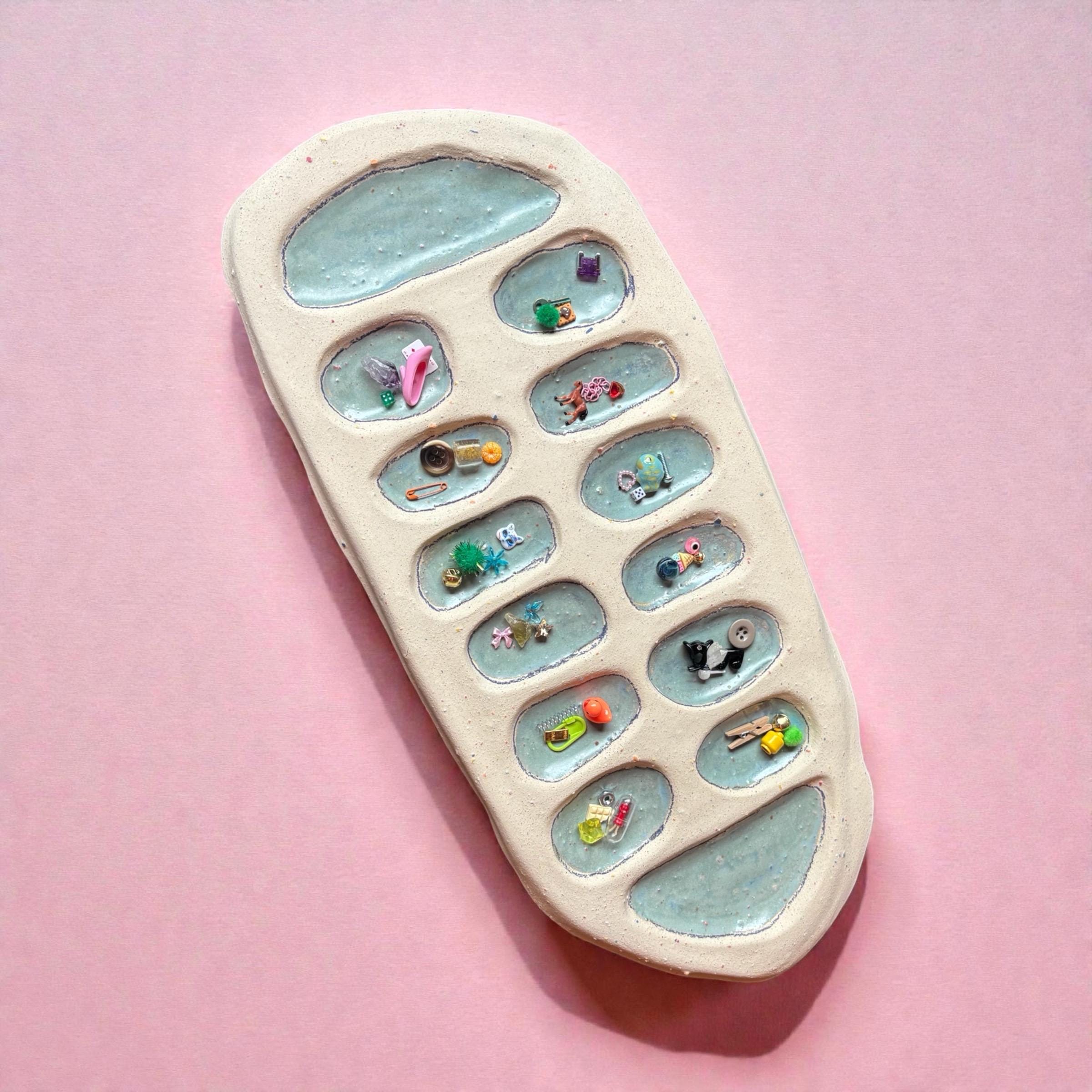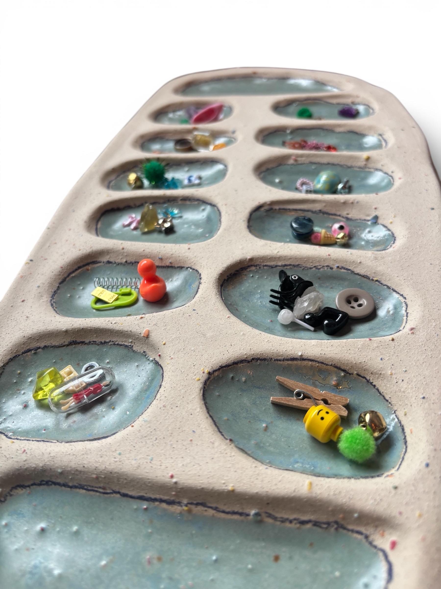Handmade rainbow speckled ceramic board with crystal blue glazed dips.