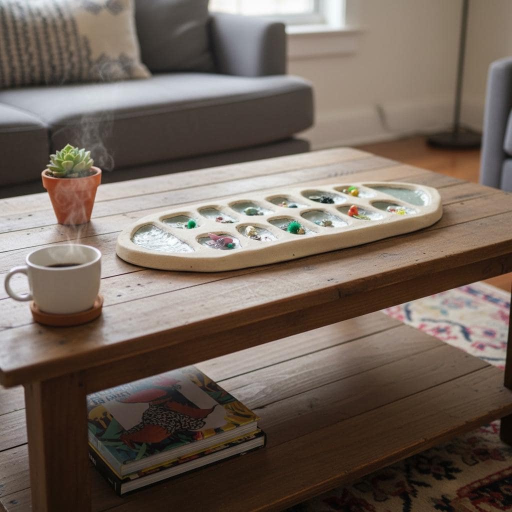 Game pieces are a collection of found objects - cool thing about this is if you loose a piece, you can easily add a new one !