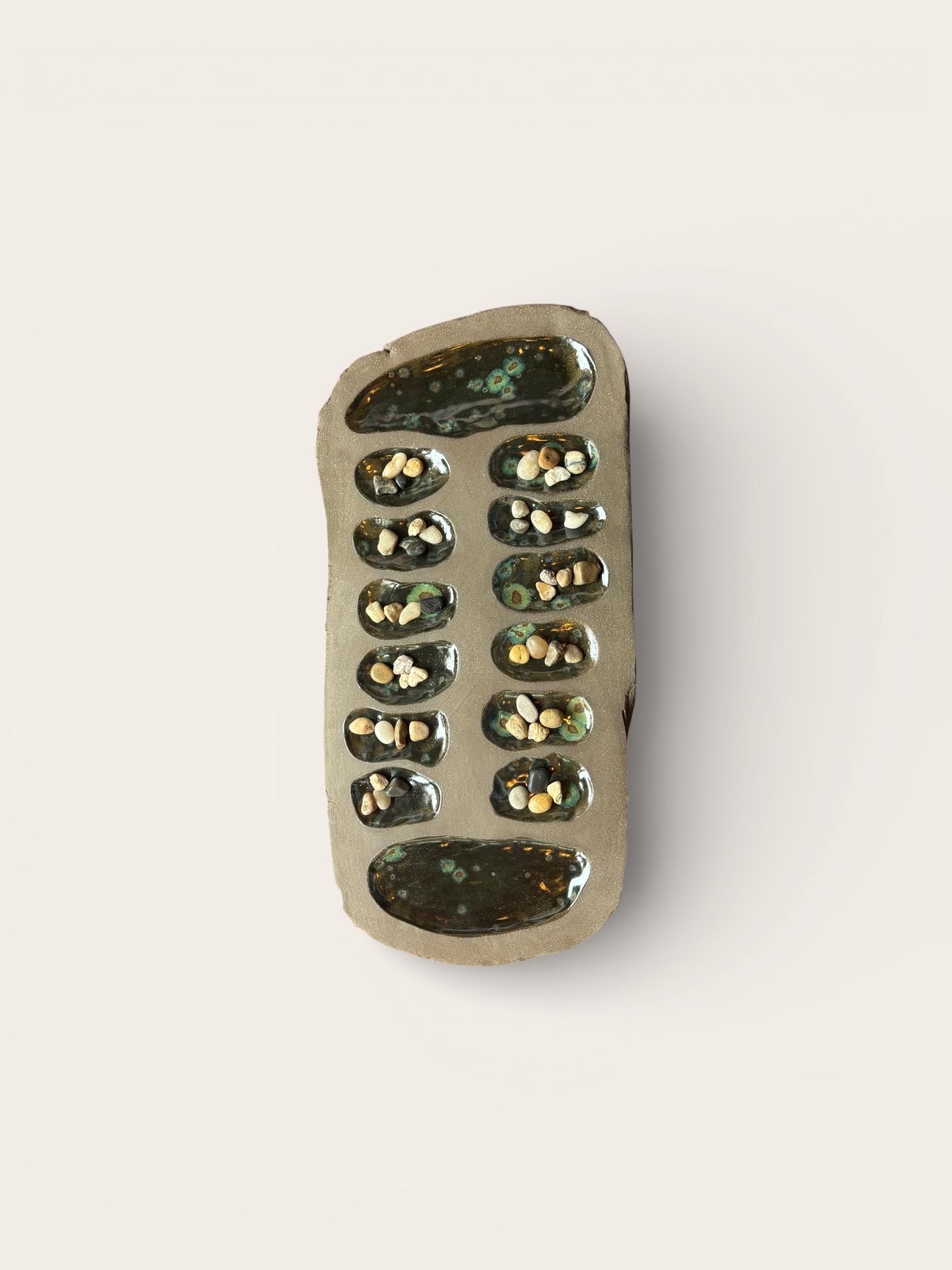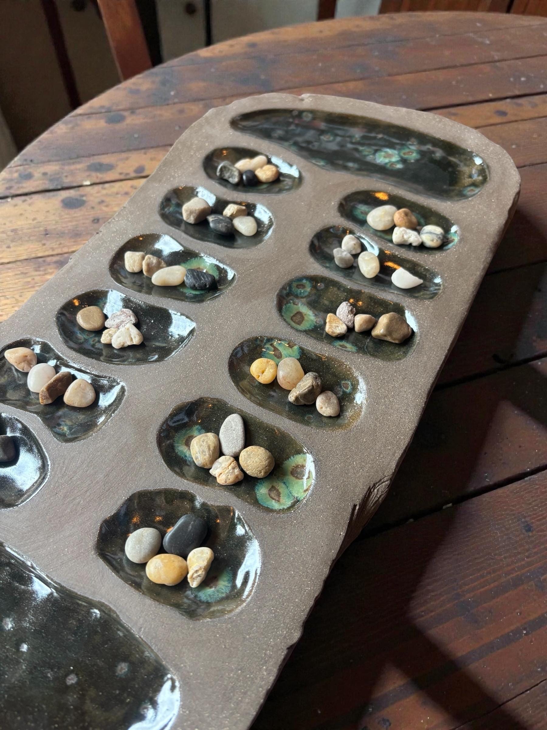 Handmade dark stoneware board with swampy green crystal glazed dips.
