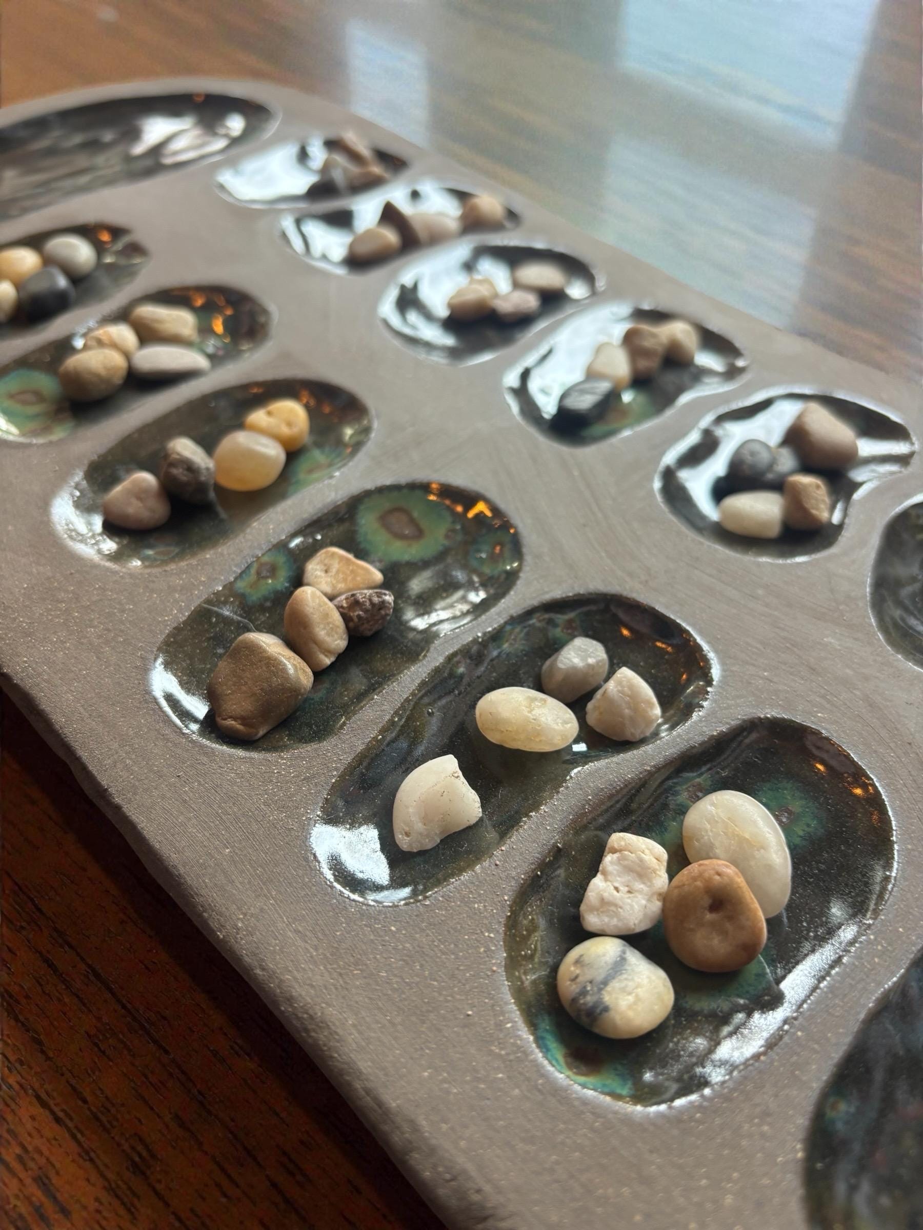 Game pieces are a collection of found rocks - cool thing about this is if you loose a piece, you can easily add a new one !