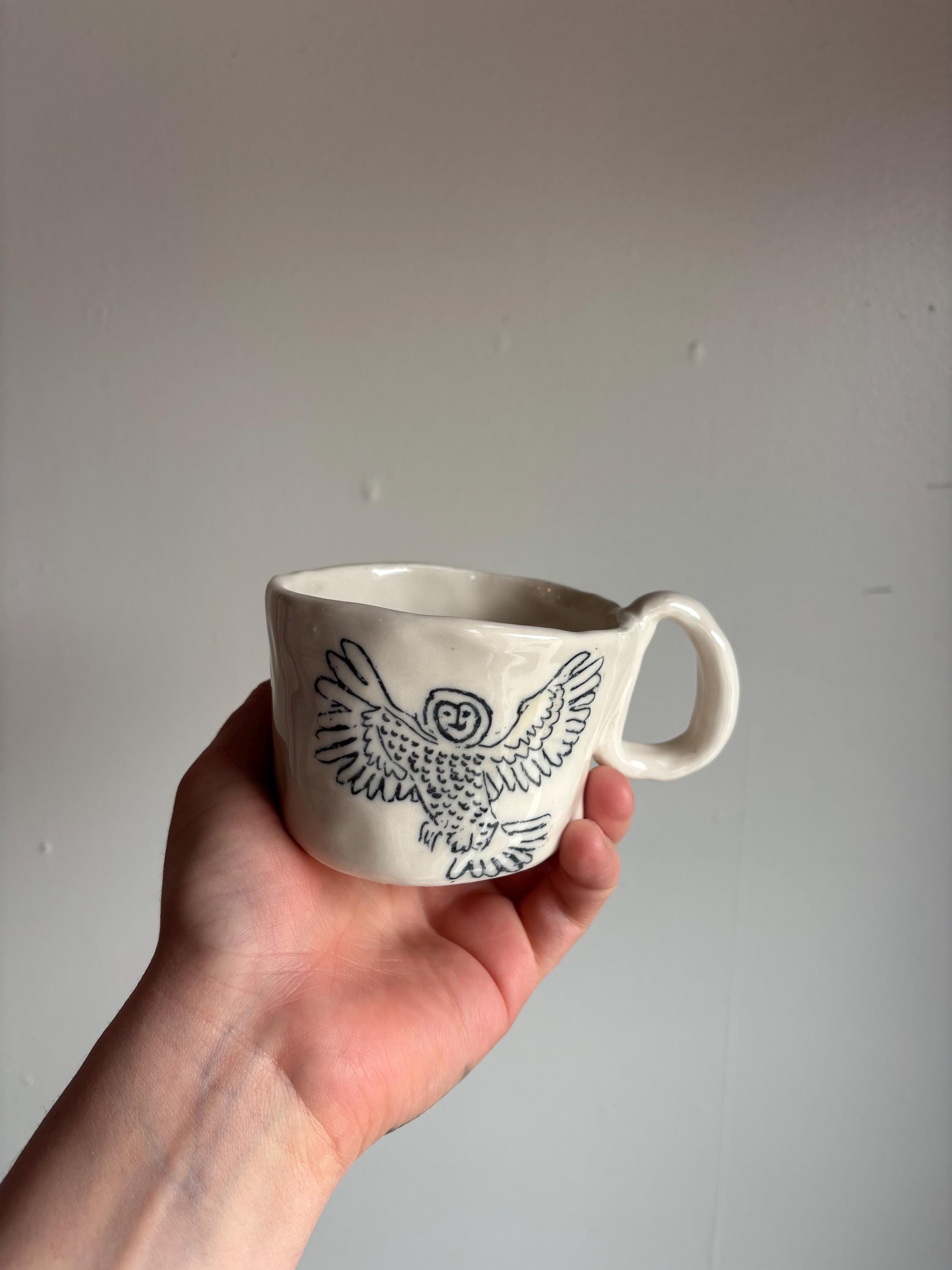 Small porcelain hand built mug with owl inlay