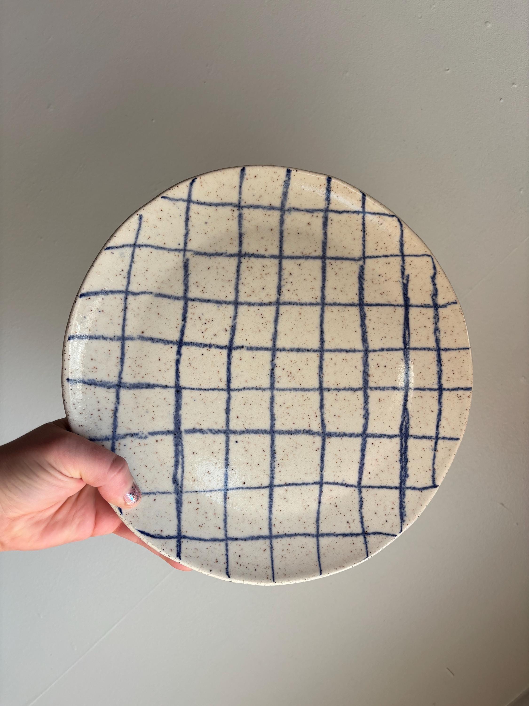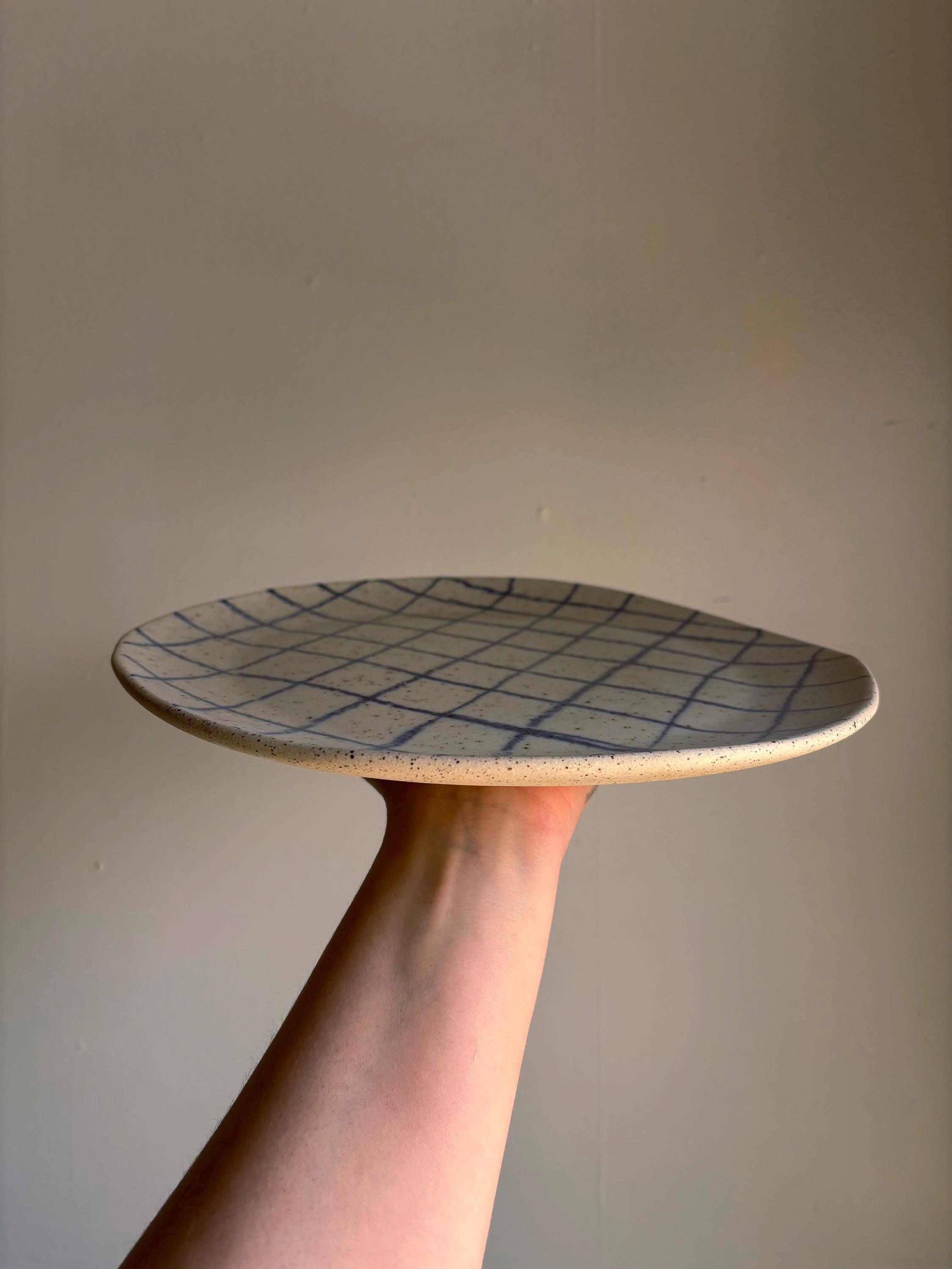 Slab built plate with glazed top and raw clay bottom.