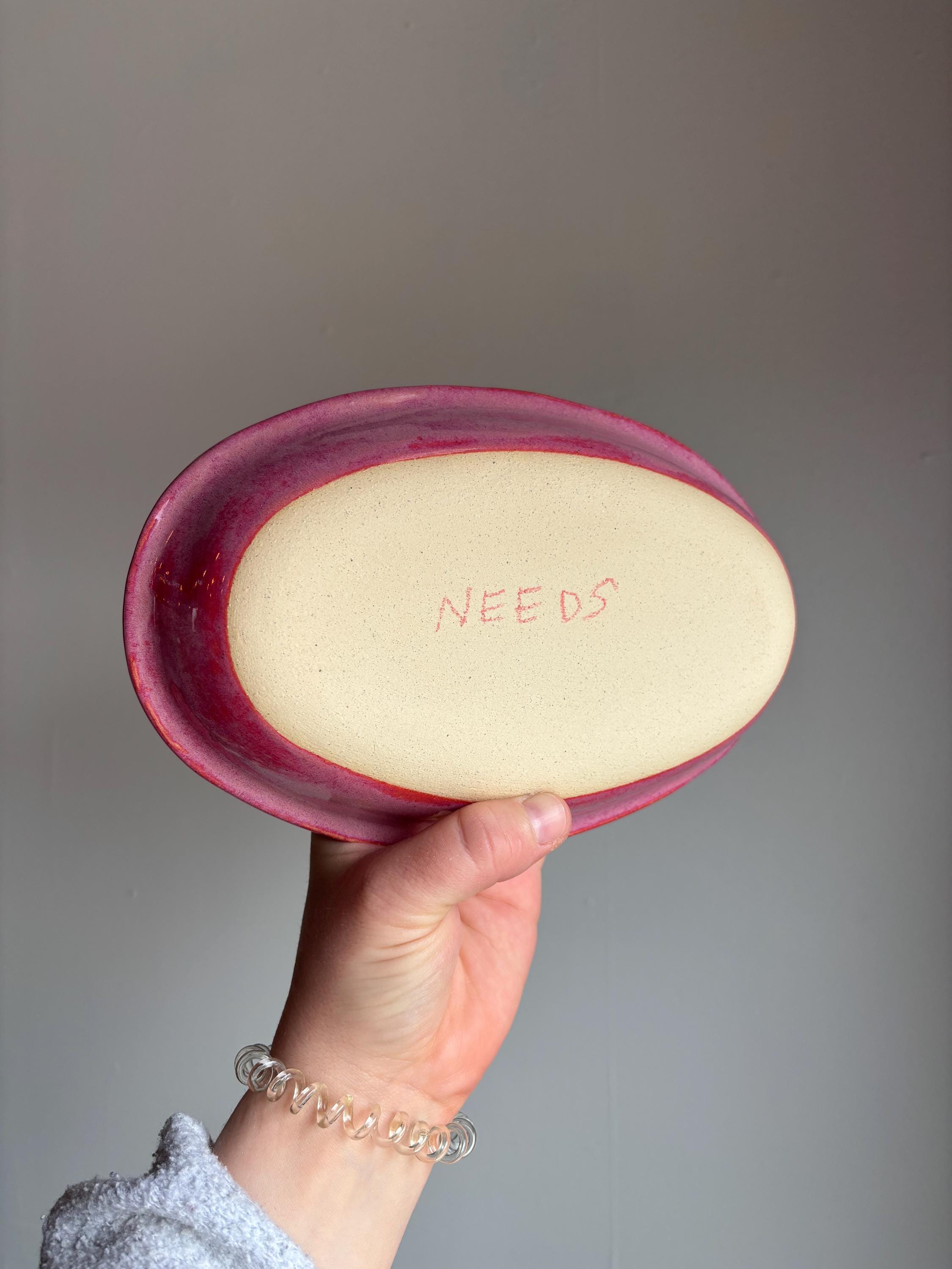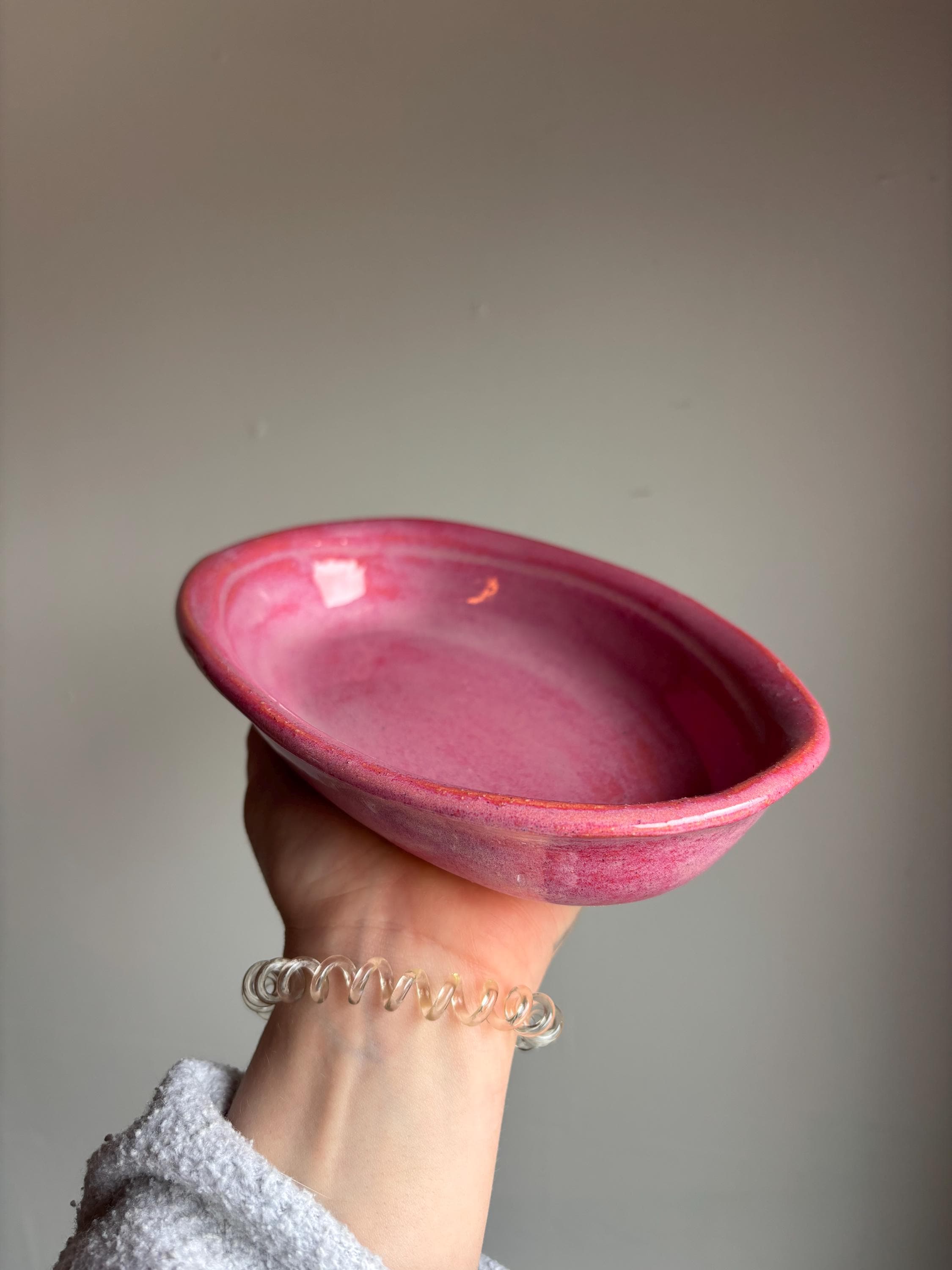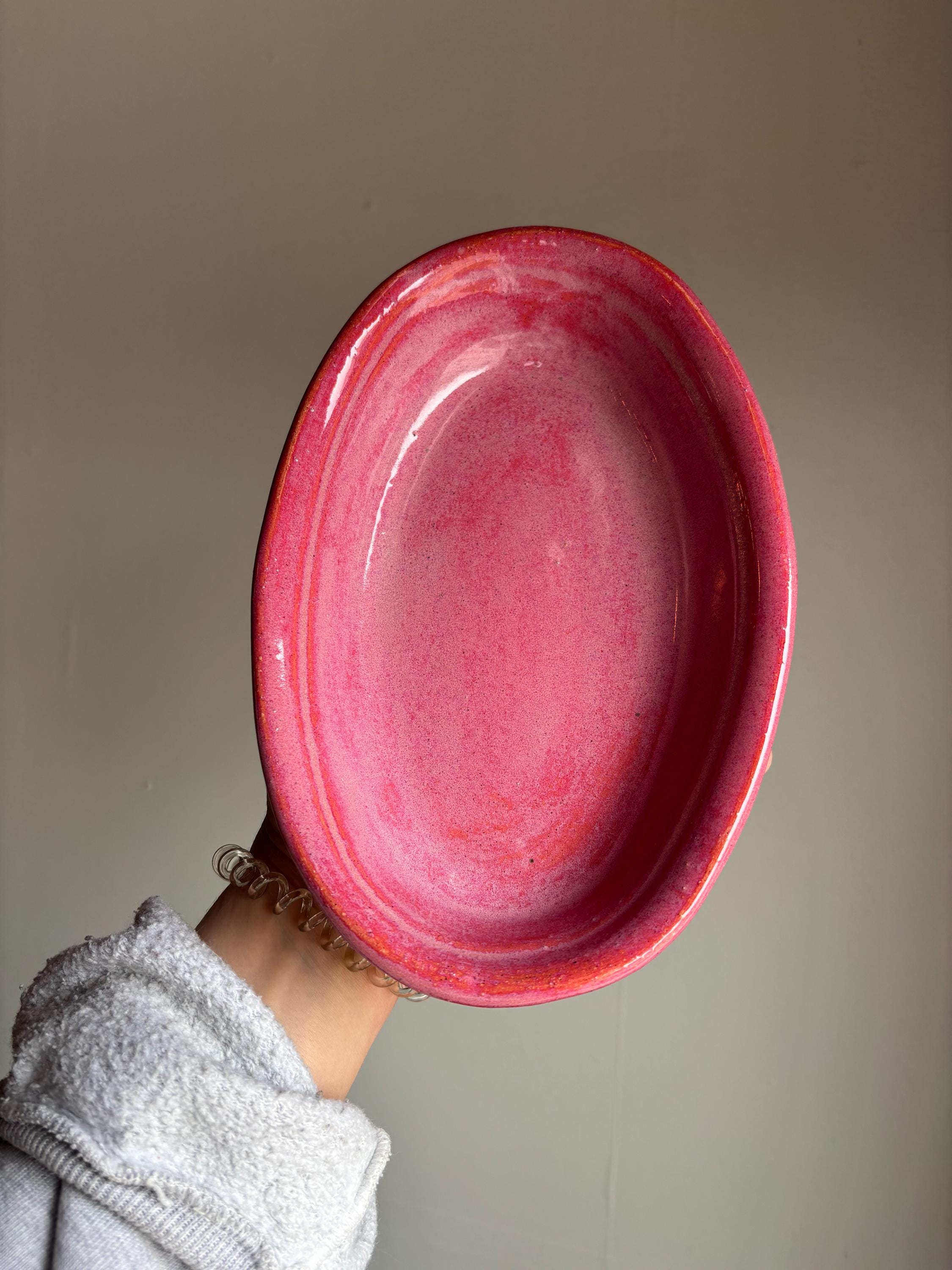 Speckled stoneware with bright pink glaze.