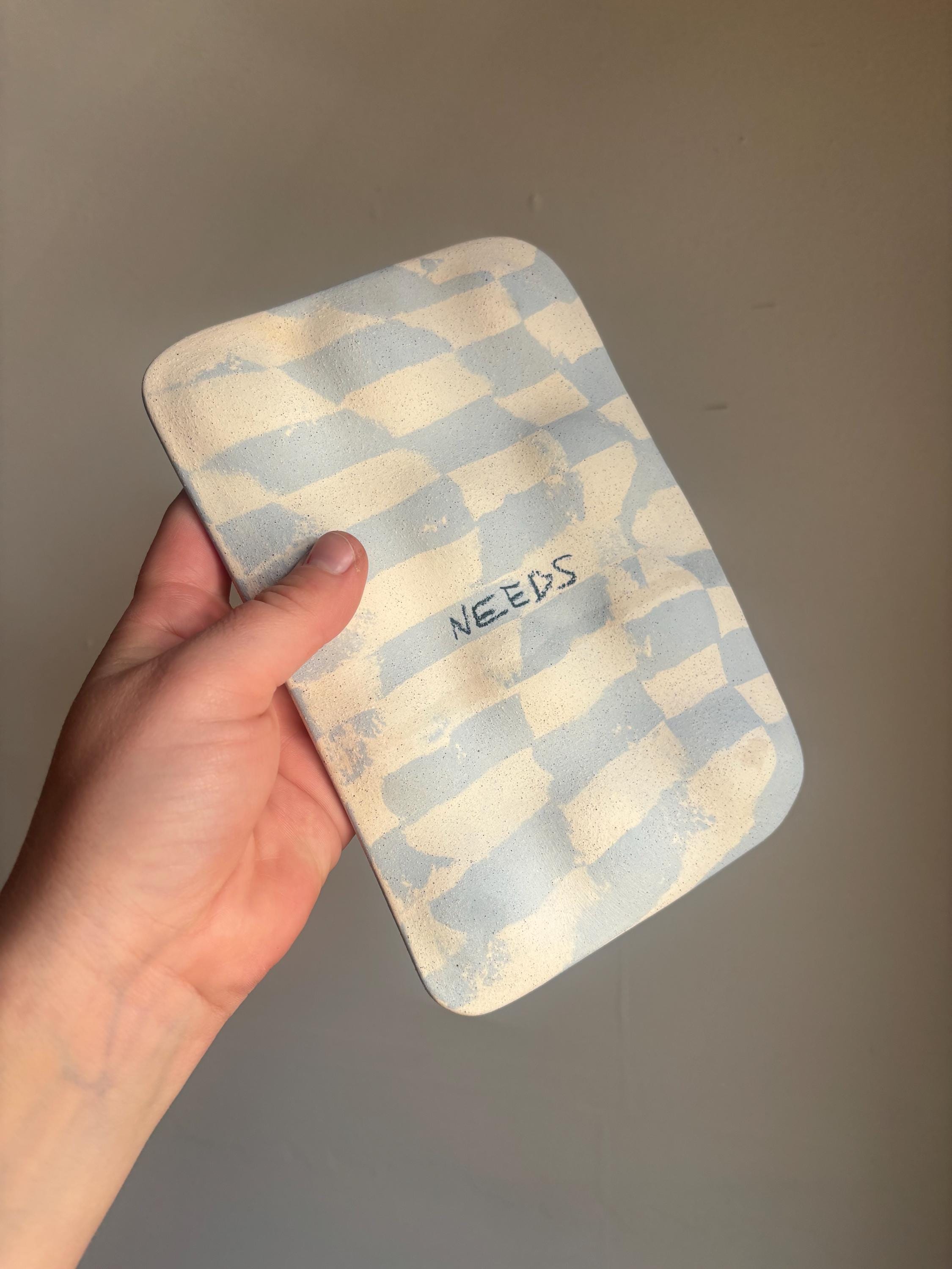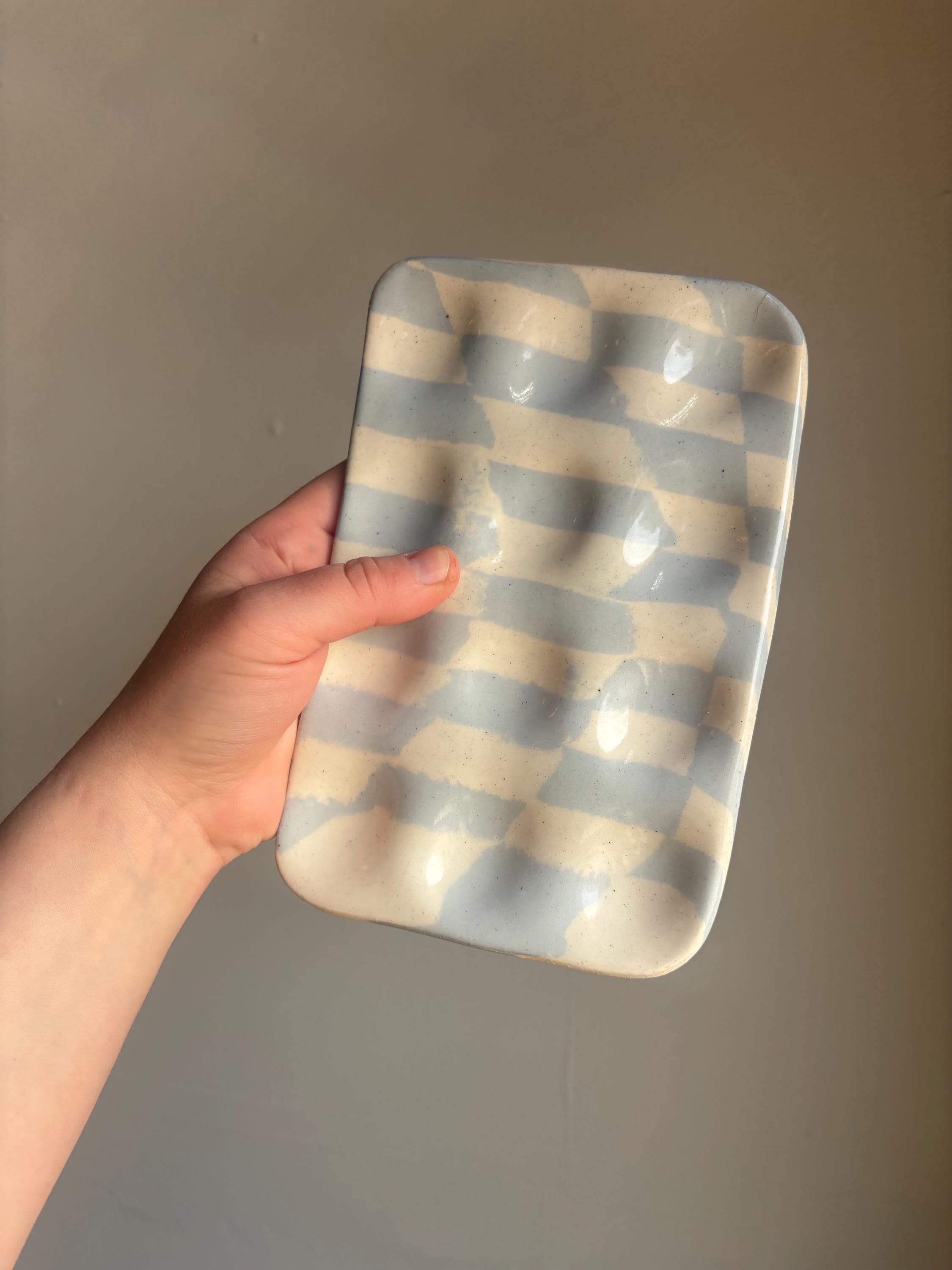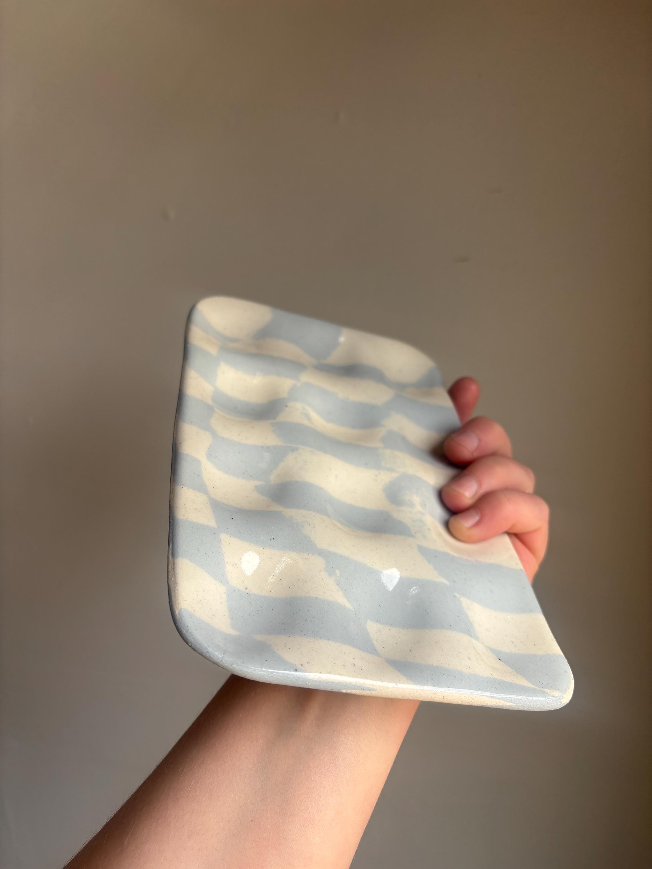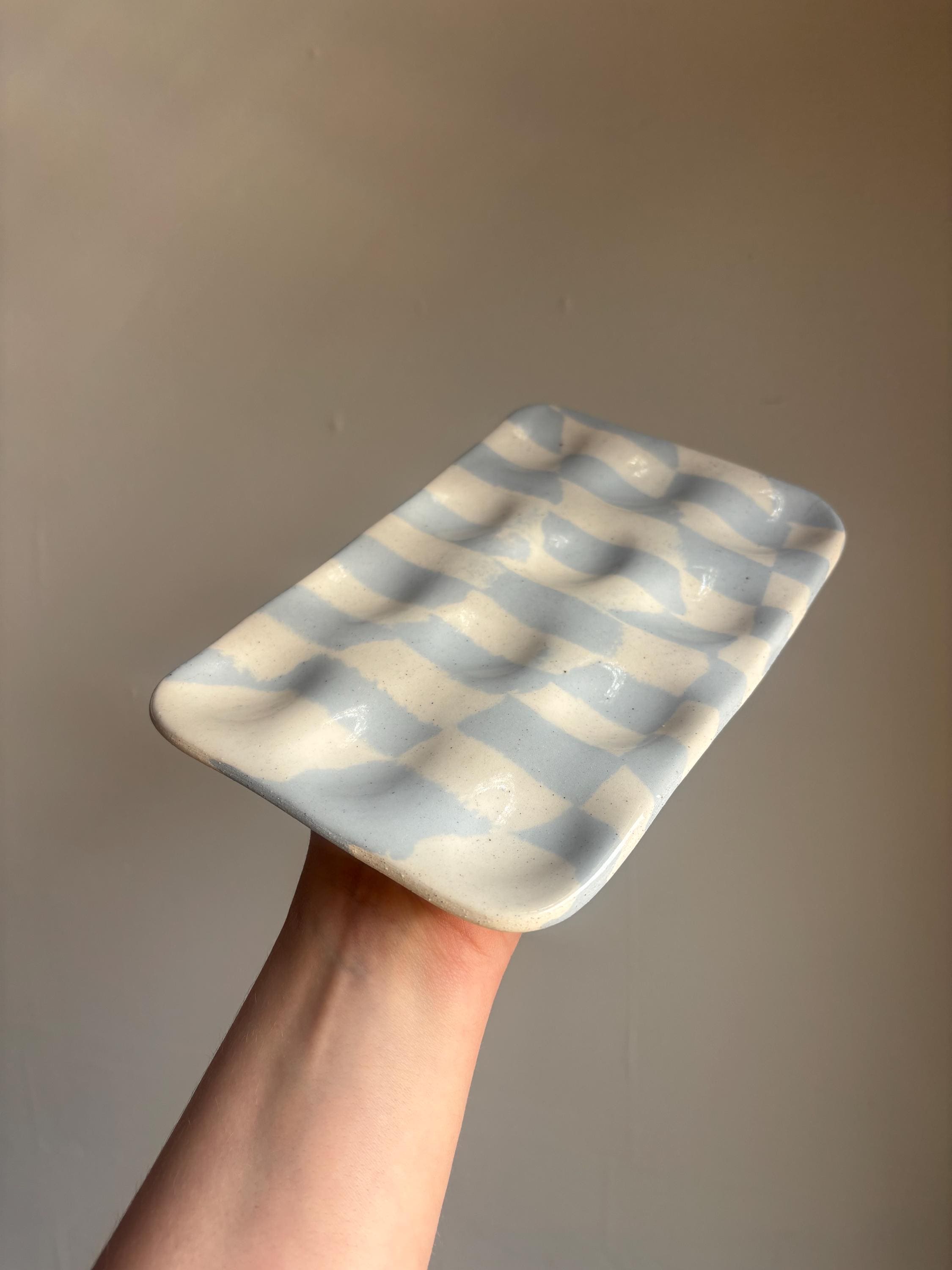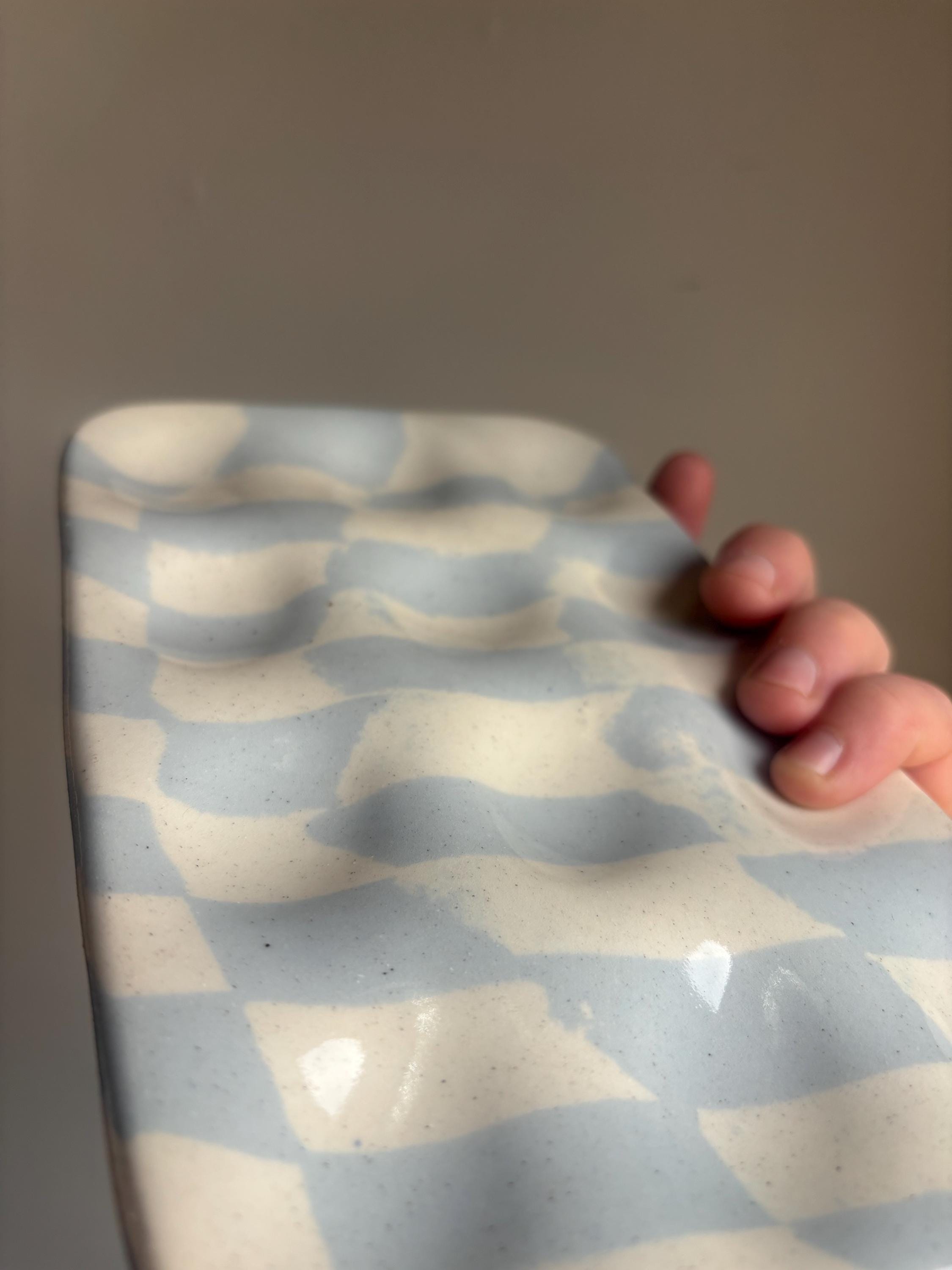 blue and white checkered stoneware clay pressed into a deviled egg holder.